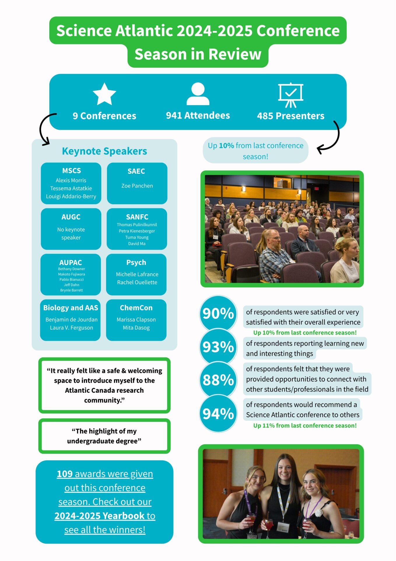 The 2024-2025 conference season was an incredible success! We created a space where 941 of the Atlantic region’s most talented researchers could connect and collaborate. Overall satisfaction rates were up, and we had a 10 percent increase in the number of student presenters this year!