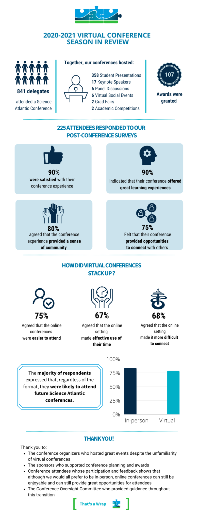We’ve prepared a report on the virtual conference season based on the review of conference debriefs submitted by organizers and on the analysis of registration and attendee experience survey data. Review the report here. We’ve also created an infographic to highlight our successes, check it out below!